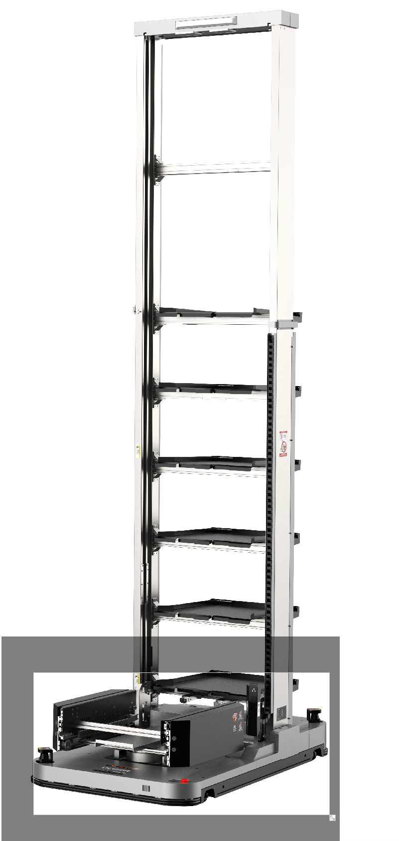 車(chē)身低矮,可以進(jìn)入低矮的料架地下?tīng)恳摲鼱恳⑶译p向運(yùn)行可以使轉(zhuǎn)彎半徑縮小,占地面積小。 驅(qū)動(dòng)單元一鍵電動(dòng)升降方便維護(hù)。最多可以指定1024個(gè)站點(diǎn)。 激光傳感器安全防護(hù)到位